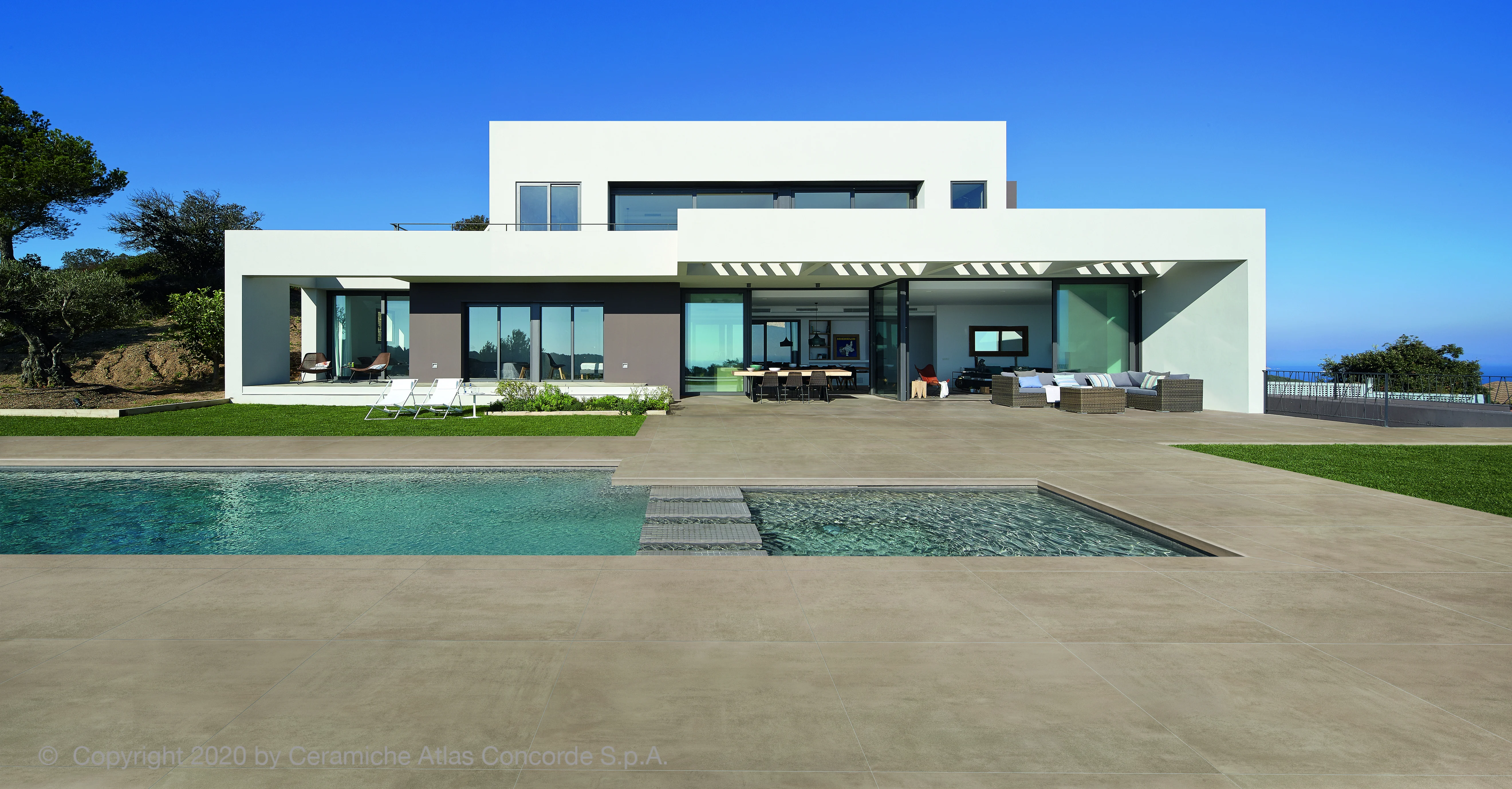 Die Terrassenplatten sind 2 cm stark, Sie kommen als Terrasse, Gehwege oder Verkleidungen von Treppenstufen zum Einsatz. Auch der Pool mit seinem blauen Wasser wird stilgerecht umrandet mit der Betonoptik.